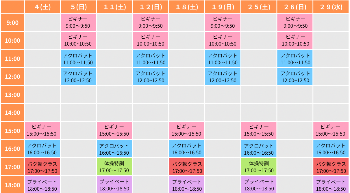 クラス内容は、トランポリン・バク転・体操を中心に、基礎から応用まで段階的に学べる構成となっています。